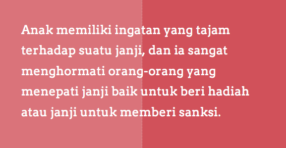 Anak memiliki ingatan yang tajam terhadap suatu janji, dan ia sangat menghormati orang-orang yang menepati janji baik untuk beri hadiah atau janji untuk memberi sanksi.