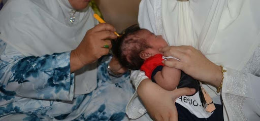 Dan untuk masalah mencukur rambut bayi yang baru lahir ini yang benar adalah mencukur seluruh rambut yang ada di kepala, bukan hanya sebagiannya saja.