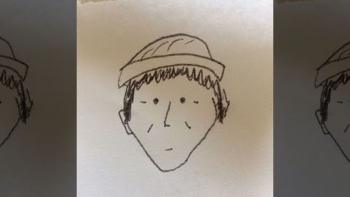 Sketsa wajah yang digambar oleh saksi, menunjukkan sebuah wajah dengan titik mata, garis untuk hidung, dan coretan untuk rambut dan topi.