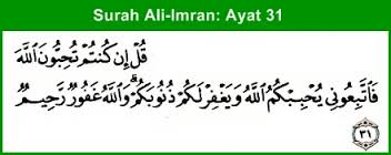 Firman Allah : Katakanlah ( wahai Muhammad ) : "Jika benar kamu mencintai Allah, ikutilah aku , niscaya Allah mengasihi dan mengampuni dosa - dosamu . Dan ( Ingatlah ) Allah Maha Pengampun lagi Maha Mengasihi . "