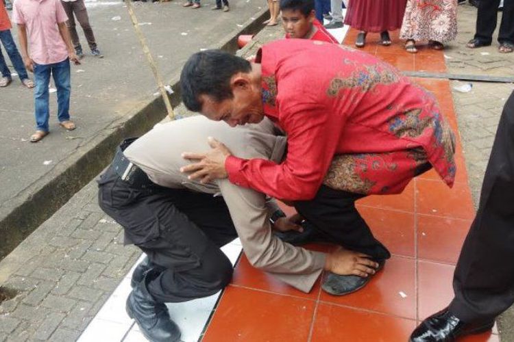 Seorang polisi muda, Bripda Asrul (20) mencium kedua kaki ayahnya, Syamsuar (45), setelah dilantik menjadi polisi. Dia bersyukur karena bisa menuntaskan pendidikan selama 7 bulan di SPN.
