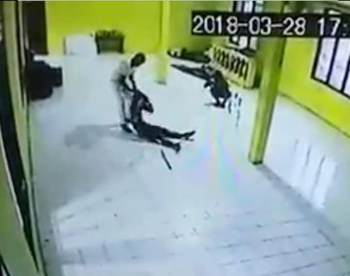 Peristiwa terjadi di lantai dua gedung aula yang juga digunakan sebagai ruang belajar. Pelaku berinisial MA (23), yang kesehariannya bertugas sebagai guru bantu di sekolah terserbut, menganiaya dua orang muridnya menggunakan kayu hingga terjatuh ke lantai.