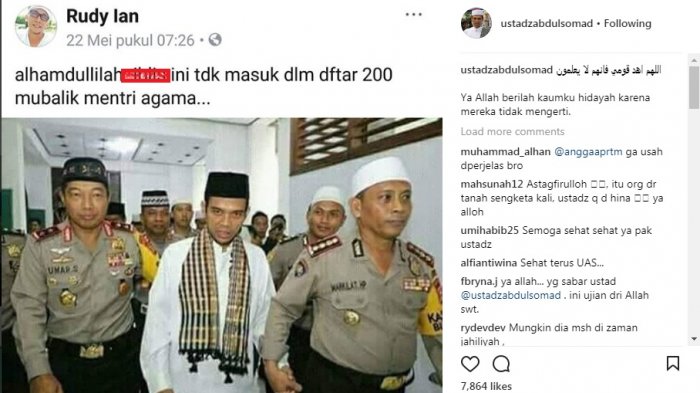 Melalui akun instagram miliknya, Ustaz Abdul Somad memposting capture foto postingan Rudy Ian.