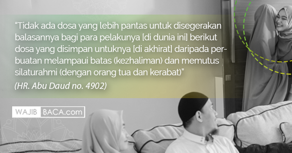 “Tidak ada dosa yang lebih pantas untuk disegerakan balasannya bagi para pelakunya [di dunia ini] -berikut dosa yang disimpan untuknya [di akhirat]- daripada perbuatan melampaui batas (kezhaliman) dan memutus silaturahmi (dengan orang tua dan kerabat)” (HR. Abu Daud no. 4902, Tirmidzi no. 2511, dan Ibnu Majah no. 4211, shahih).