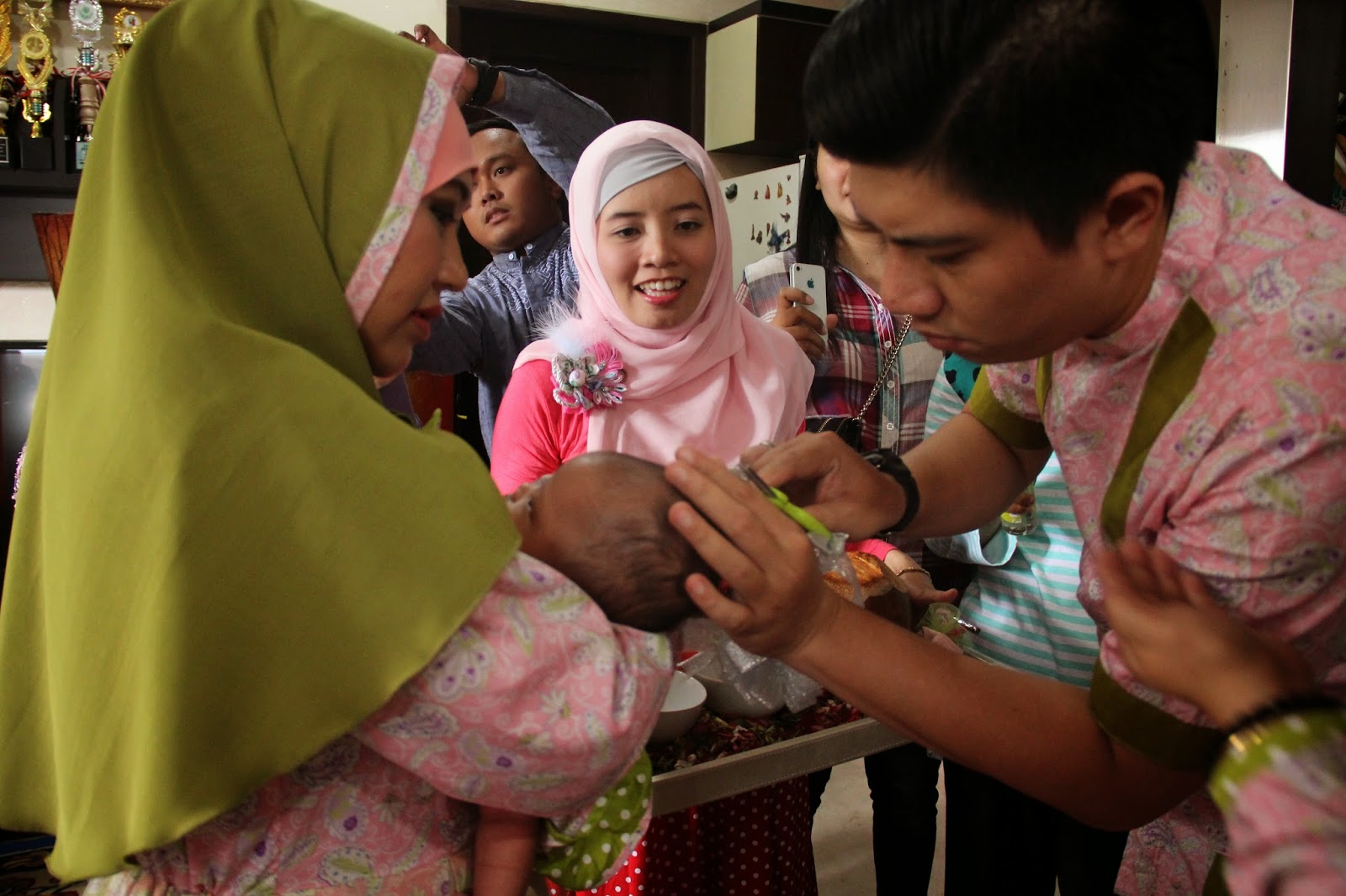 “Dahulu kami dimasa jahiliyah apabila salah seorang diantara kami mempunyai anak, ia menyembelih kambing dan melumuri kepalanya dengan darah kambing itu. Maka setelah Allah mendatangkan islam, kami menyembelih kambing, mencukur atau menggundul kepala si bayi dan melumurinya dengan minyak wangi.” [HR. Abu Daud juz 3 hal 107].