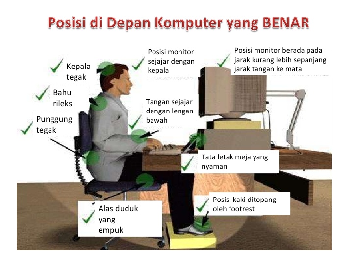 Maka pastikan jarak dan posisi kepala Anda dengan layar komputer tidak menyebabkan otot-otot leher Anda kaku dan tegang.