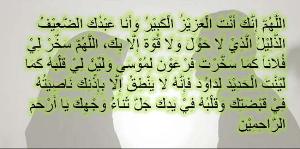 Artinya : "Ya Allah, sesungguhnya Engkau adalah Dzat Yang Maha Mulia lagi Maha Besar. Sedangkan aku hanyalah hamba-Mu yang sangat hina. Tiada upaya dan kekuatan, kecuali berasal dari-Mu. Ya Allah, tundukkanlah (ganti dengan nama orang yang Anda maksud) padaku, seperti saat Kau telah menundukkan Fir’aun untuk Musa AS. Dan luluhkan hatinya untukku, seperti saat Kau meluluhkan besi untuk Daud AS. Karena sesungguhnya dia tak akan bicara kecuali atas IzinMu, ubun-ubunnya dalam genggaman-Mu, dan hatinya di tangan-Mu. Pujian wajah-Mu telah Agung, wahai Dzat Yang Maha Penyayang di penyayang".