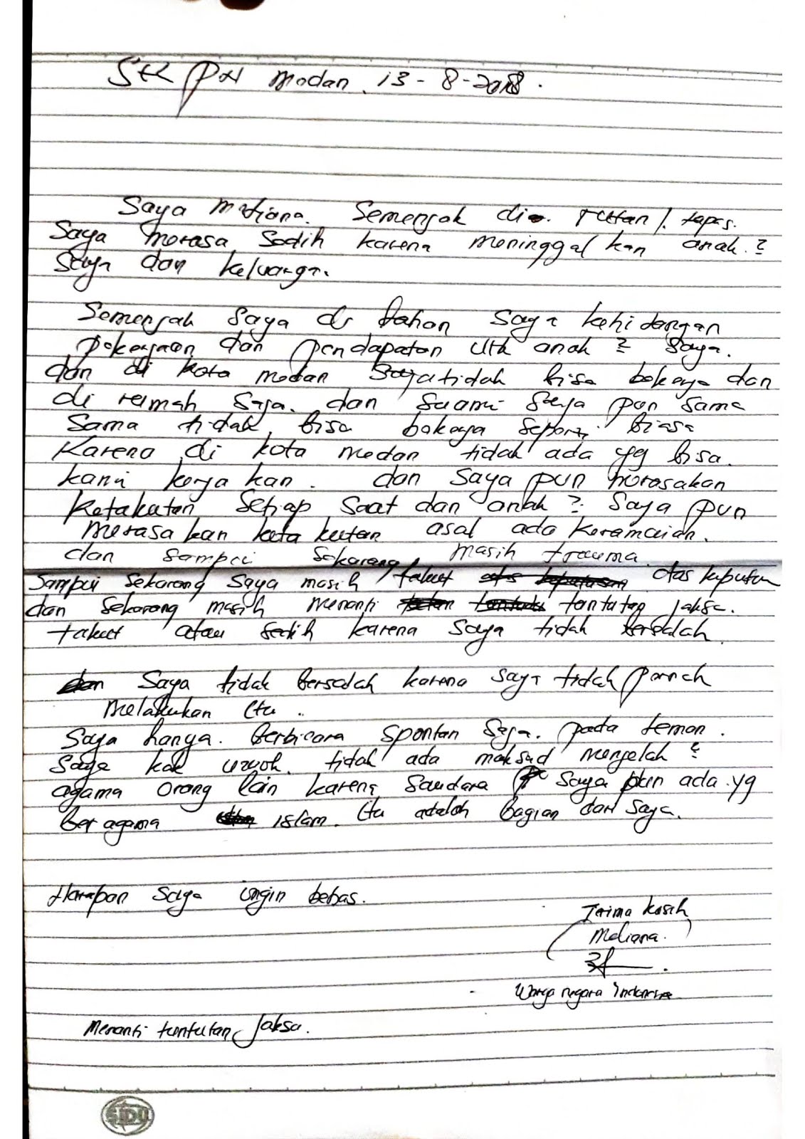 Berikut ini pleidoi yang ditulis Meiliana di selembar kertas: