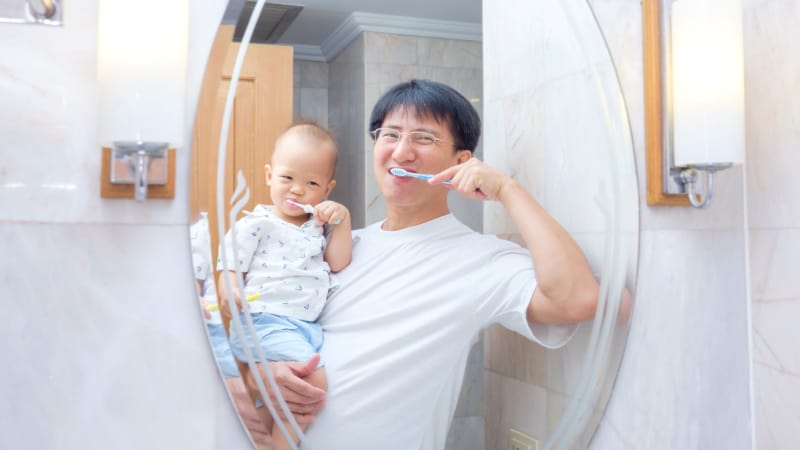 5. Saat mengajari menggosok gigi, posisi Anda sebaiknya di belakang anak sambil memegang dagungnya.