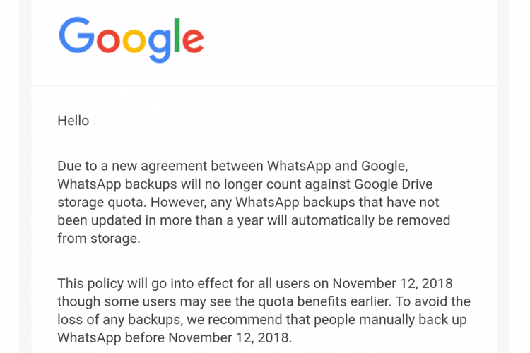 Google juga mulai menyebar e-mail pemberitahuan bagi pengguna Drive, meminta mereka melakukan backup data WhatsApp mulai sekarang.