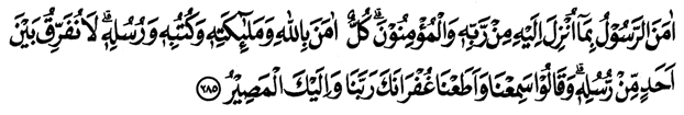 “Rasul (Muhammad) beriman kepada apa yang diturunkan kepadanya (Al-Qurān) dari Tuhannya, demikian pula orang-orang yang beriman. Semua beriman kepada Allah, malaikat-malaikat-Nya, kitabkitab-Nya dan rasul-rasul-Nya. (Mereka berkata), “Kami tidak membedabedakan seorang pun dari rasul-rasul-Nya.” Dan mereka berkata, “Kami dengar dan kami taat. Ampunilah kami, ya, Tuhan kami, dan kepada-Mu tempat (kami) kembali.”