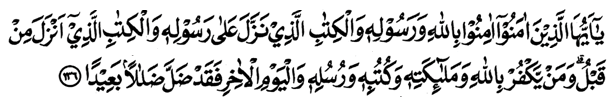 “Wahai orang-orang yang beriman! Tetaplah beriman kepada Allah Swt. dan Rasul-Nya (Muhammad saw.) dan kepada Kitab (al- Qurān) yang diturunkan kepada Rasul-Nya, serta kitab yang diturunkan sebelumnya. Barangsiapa ingkar kepada Allah Swt., malaikat-malaikat Nya, kitab-kitab-Nya, rasul-rasul-Nya, dan hari kemudian, maka sungguh, orang itu telah tersesat sangat jauh”