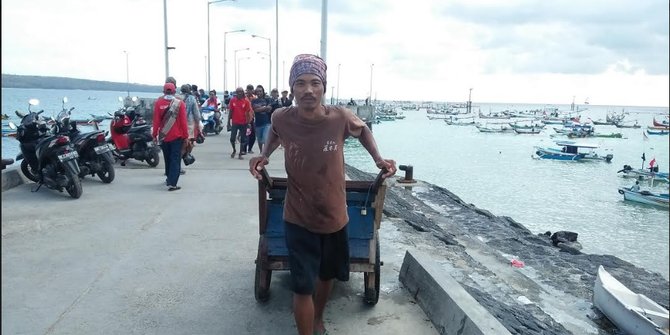 Dalam riuh suara nelayan menanti perahu datang di dermaga Pantai Kedonganan, Badung, Bali, terlihat pria dengan gerobak kayunya yang berisi empat drum air ukuran sedang. Pria ini digadang gadang bernama Sumano.