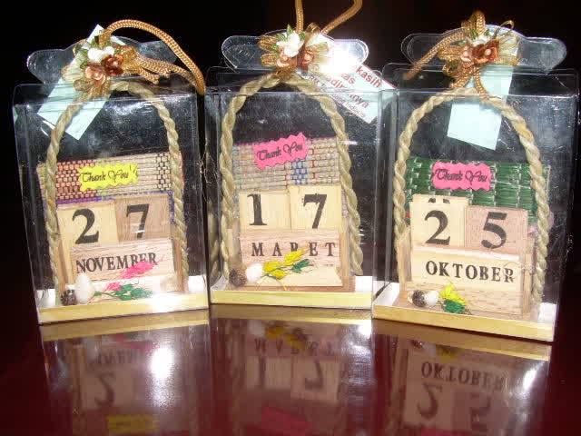 Mungkin Anda sudah sering mendapatkan souvenir pernikahan berupa kalender di acara resepsi teman-teman atau anggota keluarga. Anda pun bisa menghadirkan souvenir serupa namun lebih unik yaitu kalender kayu. Kalender ini biasanya berbentuk pipih dan dadu lengkap dengan ukiran tanggal dan bulan.