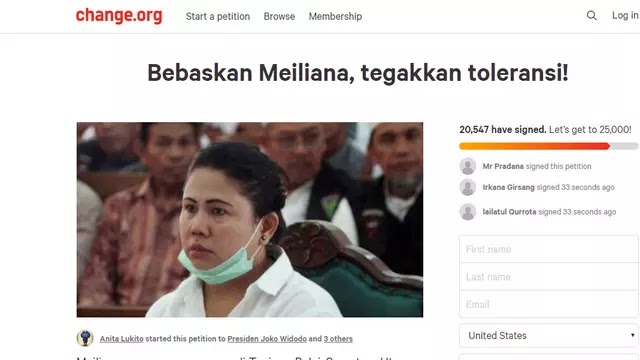 Lebih dari 20 ribu orang menandatangani petisi yang ditujukan oleh Presiden Joko Widodo, Kementerian Agama, Mahkamah Agung, dan Dewan Masjid Indonesia agar membebaskan Meiliana.