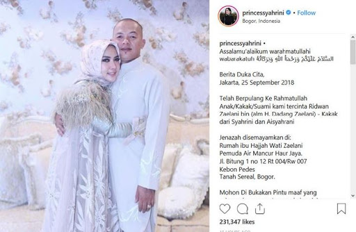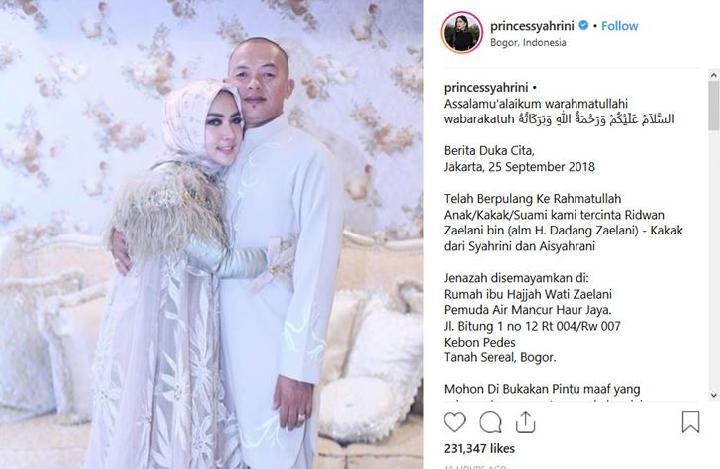 Ridwan Zaelani, kakak kandung Syahrini, meninggal pada Selasa malam, 25 September Kabar duka tersebut diketahui dari unggahan Syahrini di Instagramnya.