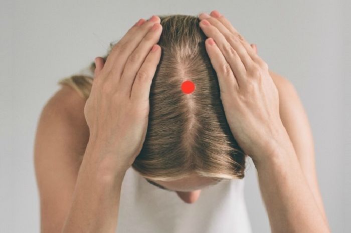 Titik ini terdapat pada bagian atas kepala Anda. Anda dapat menemukannya di bagian tengah kepala Anda dengan membayangkan sebuah garis dari telinga ke telinga.