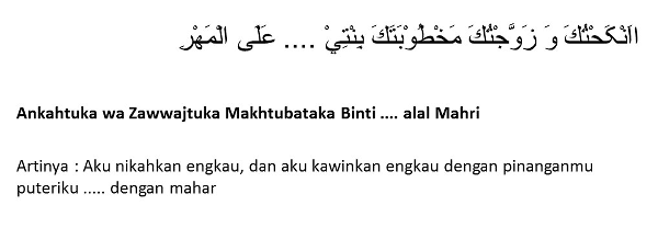 SAUDARA/ANANDA (nama pengantin pria) BIN (nama ayah calon pengantin pria) SAYA NIKAHKAN DAN SAYA KAWINKAN ENGKAU DENGAN (nama pengantin perempuan) BINTI (nama ayah pengantin perempuan) DENGAN MASKAWINNYA BERUPA (sebutkan mas kwainnya), TUNAI.