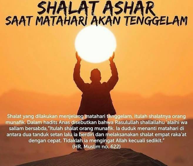 “Itulah shalatnya orang munafik, yaitu duduk mengamati matahari. Sehingga ketika matahari berada di antara dua tanduk setan atau ketika hampir tenggelam, maka dia pun berdiri untuk mengerjakan shalat ashar empat raka’at secara cepat seperti patukan ayam. Dan dia juga tidak berdzikir untuk mengingat Allah, kecuali hanya sedikit saja,” (HR. Muslim no. 622).
