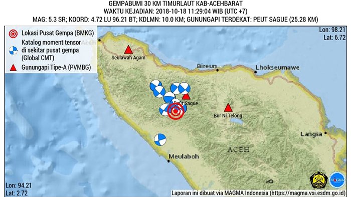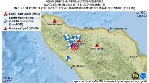 "Berdasarkan informasi dari Badan Meteorologi, Klimatologi, dan Geofisika (BMKG), pusat gempa bumi terletak pada koordinat 96,21' BT dan 4,72' LU, dengan magnitudo 5,3 pada kedalaman 10 km, berjarak 30 km timurlaut Kabupaten Aceh Barat, Aceh," sebut Kepala Pusat Vulkanologi dan Mitigasi Bencana Geologi (PVMBG) Badan Geologi Kementerian Energi dan Sumber Daya Mineral (ESDM) Kasbani, Kamis (18/10/2018).