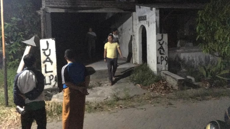 Pada kedua sisi pagar terdapat tulisan warna hitam Jual LPG. Bagian dalam rumah nampak gelap. Meski pintu terkunci rapat, jendela depan berlubang lantaran tanpa kaca.