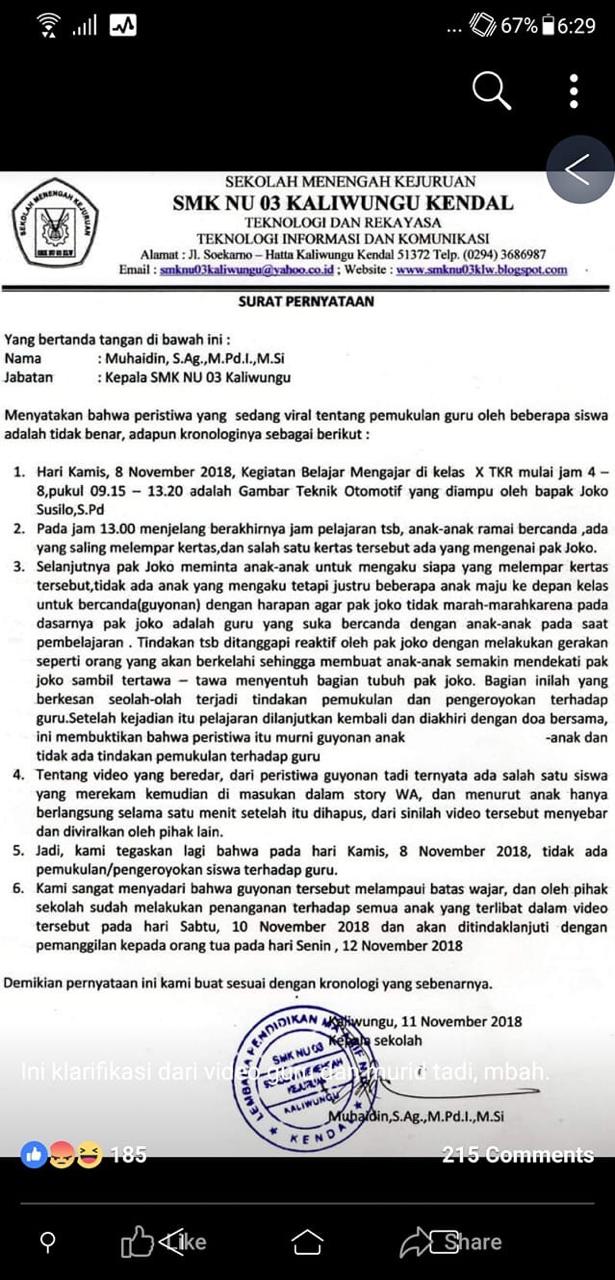 Kepala SMK NU 3 Kaliwungu Kendal, Muhaidin mengakui, orang-orang di dalam video tersebut adalah guru serta murid sekolahnya. Namun, ia membantah adanya perkelahian antara siswa dengan guru bernama Joko Susilo.