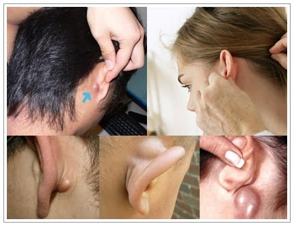 Di belakang alat pendengaran umumnya timbul benjolan berukuran besar atau kecil. Penyebabnya mungkin dapat tipe-macam dari kasus yang ringan sampai yang memerlukan bantuan medis.