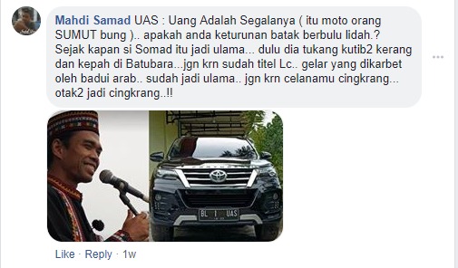 Penghinaan dan ujaran kebencian kepada Ustad Abdul Somad dan oleh akun facebook @Mahdi Samad (facebook.com)