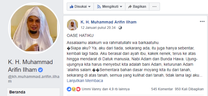 Jamaah kaget, tiba-tiba Ustadz Arifin Ilham tulis pesan ini di laman facebook beliau...