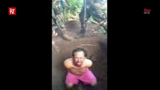 Ia hanya menggunakan celana pendek berwarna pink dan tak menggunakan baju dan berada di sebuah galian. Pria itu memohon-mohon dari bawah lubang. Sementara diatasnya berdiri dua orang pria menenteng senjata.