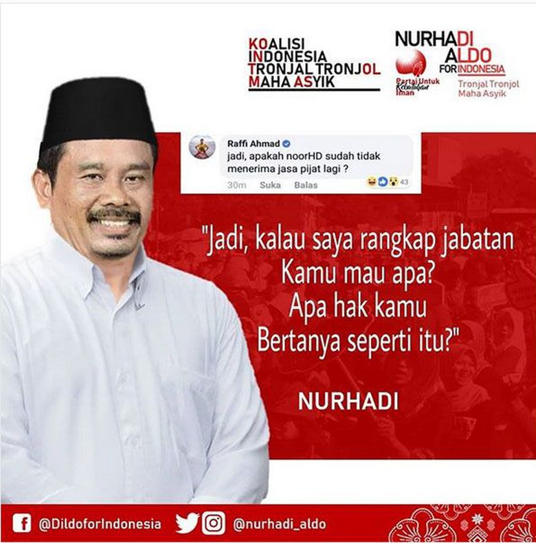 Kata dia, unggahan-unggahan saya itu lucu dan menginsiprasi," kata Nurhadi. Dari situlah kemudian capres dan cawapres bayangan, Nurhadi dan Aldo (Dildo) mulai tercipta.