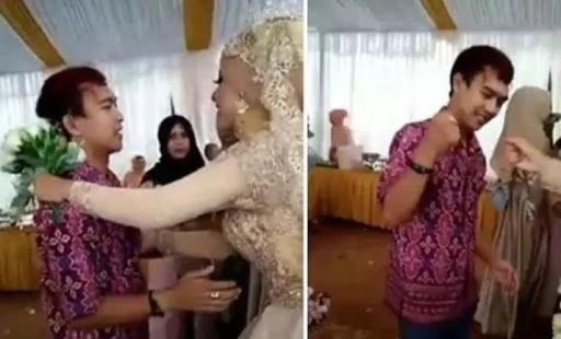 Dalam video yang dibagikan oleh akun Instagram @makassar_iinfo, tampak pemuda berkemeja batik ungu memeluk ibunda mempelai perempuan di atas panggung pelaminan.