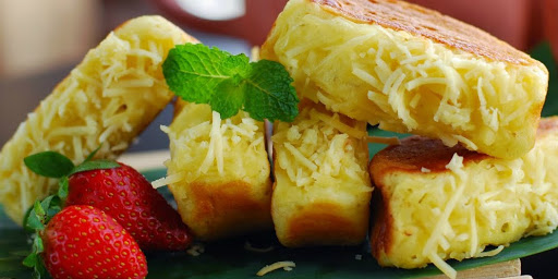 - Siapkan cetakan pukis, olesi dengan margarin dan tuangkan adonan kedalamnya secara merata. Lalu tata potongan keju dibagian atasnya secara merata.