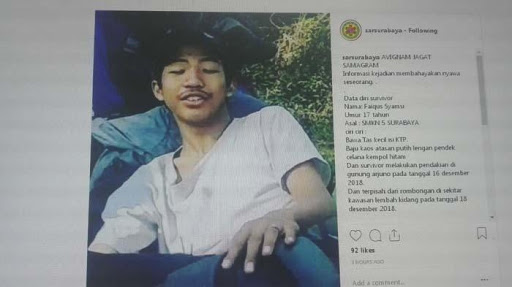 Hilang sejak Desember 2018 pemuda 17 tahun ini dinyatakan hilang di Gunung Arjuno. Tim SAR Basarnas melakukan proses pencarian mulai dari lembah kidang hingga puncak bayangan.