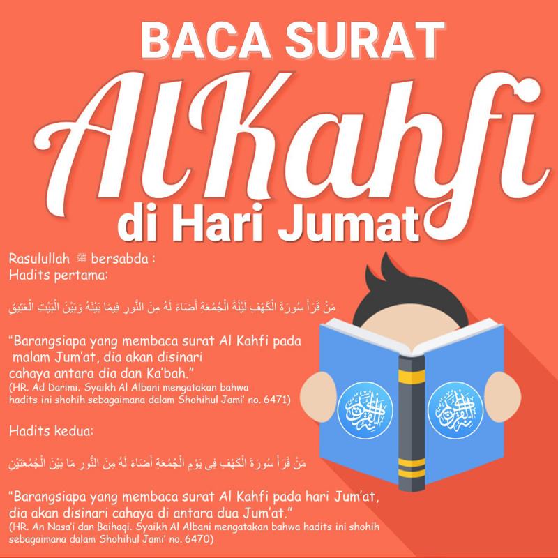 "Siapa yang membaca surat Al-Kahfi pada hari Jum’at maka akan memancar cahaya dari bawah kakinya sampai ke langit, akan meneranginya kelak pada hari kiamat, dan diampuni dosanya antara dua Jum’at.".