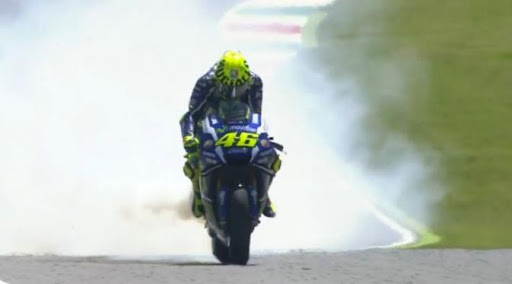 Harapan Valentino Rossi menjuarai seri MotoGP di kampung halamannya sendiri pupus sudah. Yamaha YZR M1 yang ditungganginya mengeluarkan asap. Ia terpaksa keluar sebelum menyentuh garis finish.
