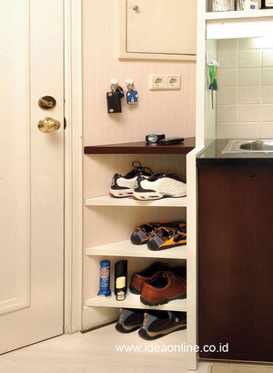 Sepatu atau sandal yang tergeletak dan berserakan di lantai tentunya tidak sedap untuk dipandang. Untuk mengatasi masalah ini, anda perlu sebuah rak penyimpanan sepatu. Namun demikian, seperti yang telah dijelaskan bahwa kondisi interior rumah anda sudah tidak mungkin lagi untuk ditambahkan sebuah rak atau lemari penyimpanan.