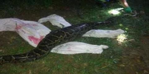 Setelah dibelah isi perut ular tersebut berupa seekor kambingMenurut tudingan sejumlah warga jika ular piton tersebut telah memangsa seekor kambing milik Lin sendiri. Pada dasarnya , Lin ini merupakan warga perternak kambing terbesar di provinsi Fujian, China.