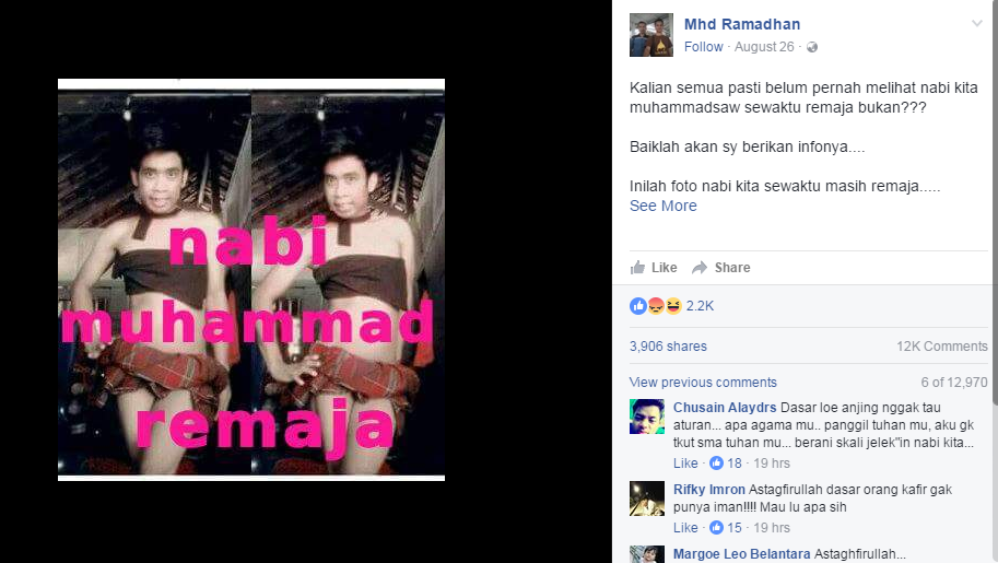 "Kok kalo lihat tulisan di alquran kayak CACING yah??? Sebetulnya banyak yg kaga paham bahwa alquran itu bukan wahyu alloh swt, melainkan perkataan nabi TEMPEKK PWELER ASUUU si muhammadsaw...Semoga banyak yg paham dan sadar...Amin ya alloh.." Dan yang sudah dilaporkan adalah status yang diupdate pada 26 Agustus lalu, yang menghina Nabi Muhammad,