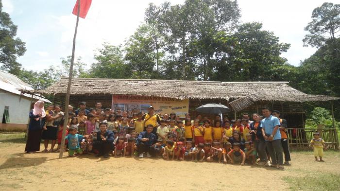 Tim Duta Pendidikan berfoto bersama siswa dan guru SD N 2 Elok Kolong, Desa Tebuah Kecamatan Tuah Subah Kabupaten Sambas, Sabtu (8/10/2016). Foto tribun pontianak.Meskipun mereka hanya digaji dengan beras hasil pemberian warga tidak menghalangi semangatnya untuk mencerdakan anak bangsa. Mereka harus mencari tambahan biaya hidup dengan mengojek bahkan tak jarang mereka harus mencari emas di sungai demi mencukupi kebutahan sehari hari.