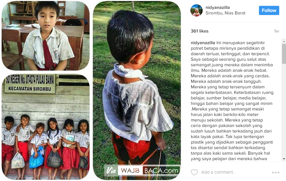 Dalam postingannya, Ia membagikan foto-foto siswa SD dengan fasilitas yang sangat minim. Padahal, semangat mereka untuk belajar sangat besar. Beberapa dari mereka, ada yang mengenakan pakian lusuh, kotor bahkan sobek dibagian kerahnya. Mereka juga masih memakai sandal jepit dan kantong plastic untuk tas mereka.