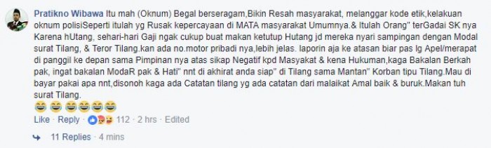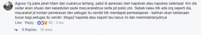 "Itu mah (oknum) begal berseragam," tulis Pratikno Wibawa.""Bikin resah masyarakat, melanggar kode etik, kelakuan oknum polisi seperti itulah yang merusak kepercayaan di mata masyarakat umumnya."Pratikno Wibawa menyebut oknum polisi semacam ini sudah membuat teror dengan surat tilang. Seorang netizen lain, Aguss, menyoroti tindakan warga yang berani menentang aksi tilang yang dilakukan oleh pak polisi.
