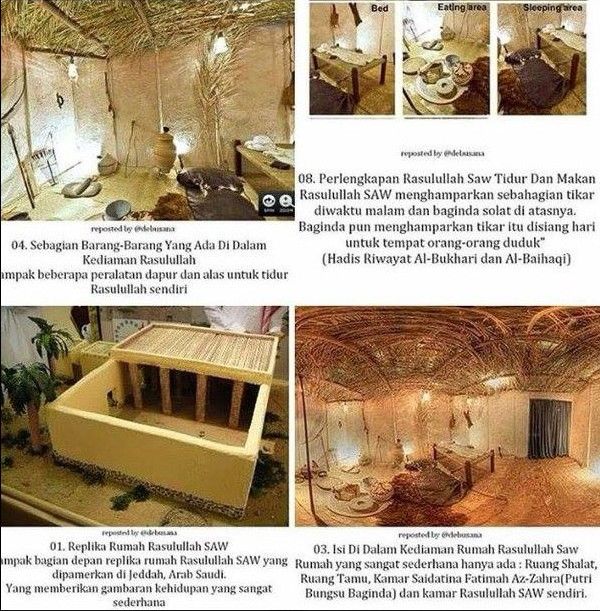Demikianlah Nabi Yang Agung itu ternyata hidup dalam kesederhanaan. Rumah beliau beralaskan tanah, dindingnya terbuat dari tanah liat, atapnya dari pelepah kurma dan di dalamnya hanya ada sedikit perabotan dilansir dari