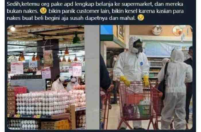 Disaat banyak petugas medis yang masih menggunakan jas hujan dan lebih membutuhkan APD. Malah dua orang ini memakainya untuk belanja di tengah kondisi yang seperti ini.