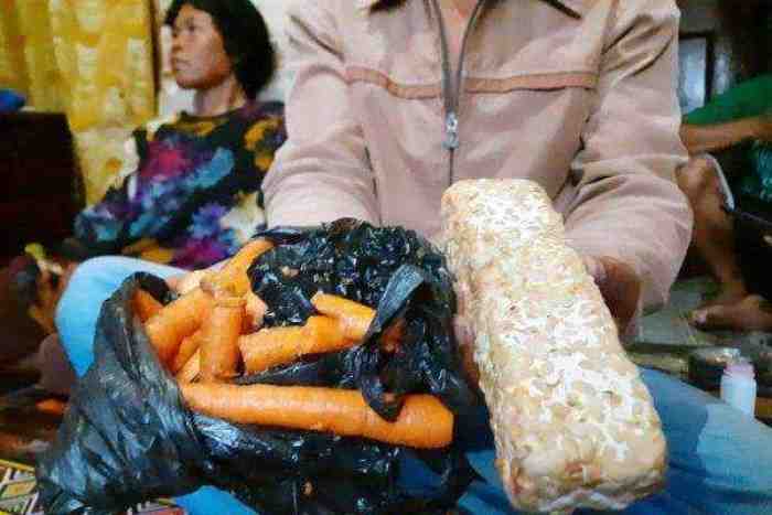 Enjang juga menjelaskan, bahan pangan yang diterima masyarakat terdiri dari telur ayam, daging ayam, sayuran dan buah-buahan. Namun sayangnya bahan pangan itu kondisinya banyak yang busuk. Bahkan daging ayam juga tercium aroma yang tidak sedap.